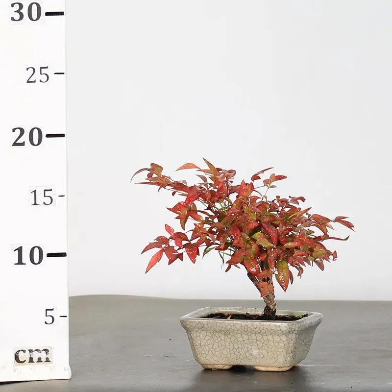 Le bonsai Nandina ou bambou sacré est un arbre au port érigé, au feuillage léger et haut . Ses tiges raides évoquent celles du bambou, son feuillage devient rougeâtre en hiver et vire au vert foncé durant l'été pour redevenir pourpre en automne. Ce bonsai fleurit en été, mais cette floraison passe inaperçue. Ses grappes blanches de 20-30cm de long sans intérêt donnent en automne des grappes de baies rouges, pendantes et très décoratives.