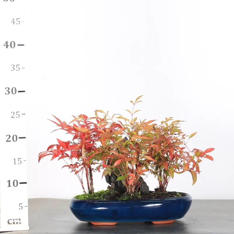 Le bonsai Nandina ou bambou sacré est un arbre au port érigé, au feuillage léger et haut . Ses tiges raides évoquent celles du bambou, son feuillage devient rougeâtre en hiver et vire au vert foncé durant l'été pour redevenir pourpre en automne. Ce bonsai fleurit en été, mais cette floraison passe inaperçue. Ses grappes blanches de 20-30cm de long sans intérêt donnent en automne des grappes de baies rouges, pendantes et très décoratives.