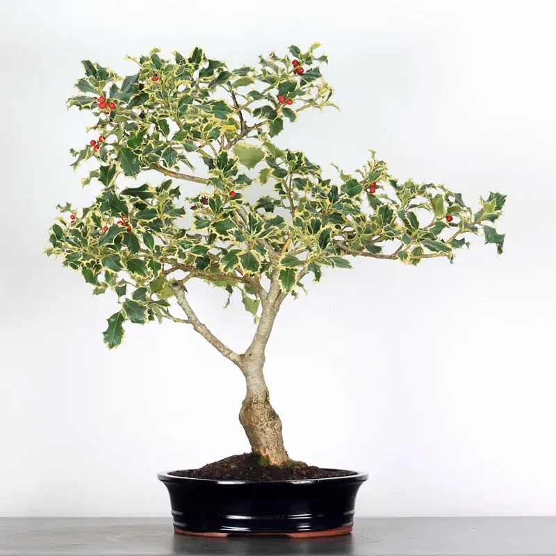 Le bonsaï Houx "Ilex aquifolium argentea marginata" est un arbuste à feuillage persistant, qui se distingue par ses feuilles vert foncé et sa structure compacte. Selon les variétés, il produit de petites baies rouges décoratives en automne et en hiver. Apprécié pour sa résistance au froid, il s’adapte bien aux climats tempérés. Un bonsaï décoratif et intemporel, parfait pour les amateurs comme pour les passionnés.