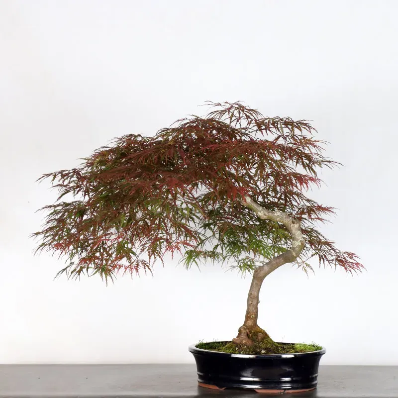 Le bonsaï érable du japon "Acer palmatum dissectum Red Garnet" est très intéressant en raison de son port retombant en cascade et de ses feuilles finement découpées changeantes au fil des saisons, passant du rouge/pourpre lumineux au printemps, puis vert en été, pour redevenir rouge vif à l’automne. Ils sont tous cultivés depuis plus de 30 ans chez nous en pépinière.