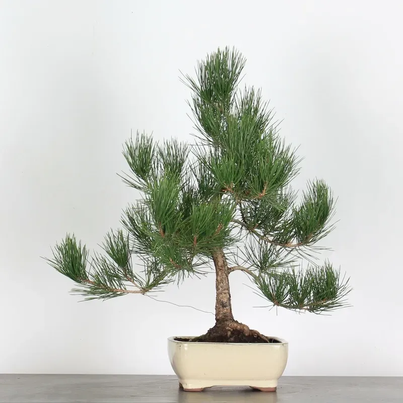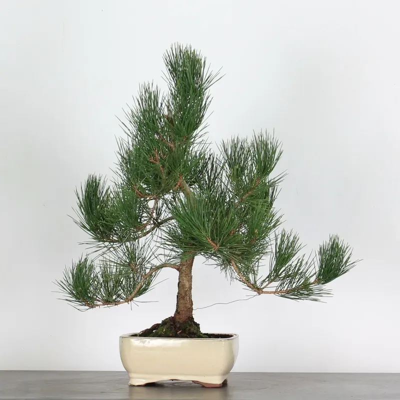 Le Pin Thunbergii est une essence de virilité par excellence : arbre droit, magnifique, puissant, bien "assis" dans son pot, se dresse vers le ciel. Le tronc sombre, avec une écorce crevassée, offre un saisissant contraste avec les aiguilles vert assez clair, pleines de fraîcheur et de santé.