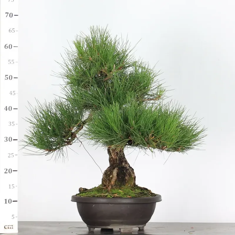 Le Pin Thunbergii est une essence de virilité par excellence: arbre droit, magnifique, puissant, bien "assis" dans son pot, se dresse vers le ciel. Le tronc sombre, avec une écorce crevassée, offre un saisissant contraste avec les aiguilles vert assez clair, pleines de fraîcheur et de santé.
