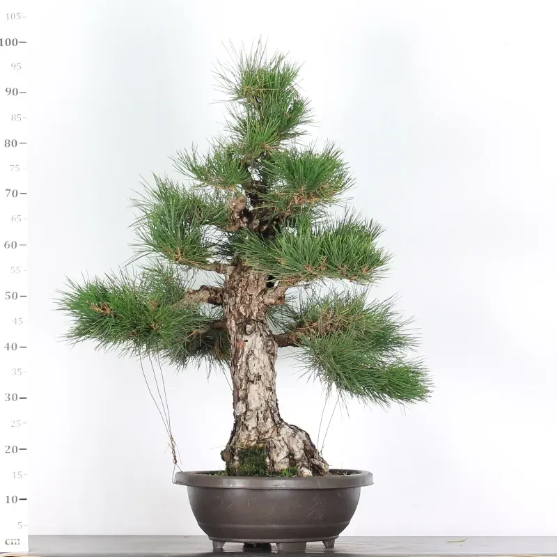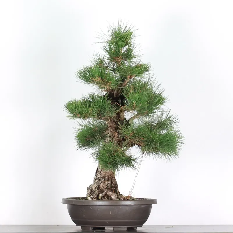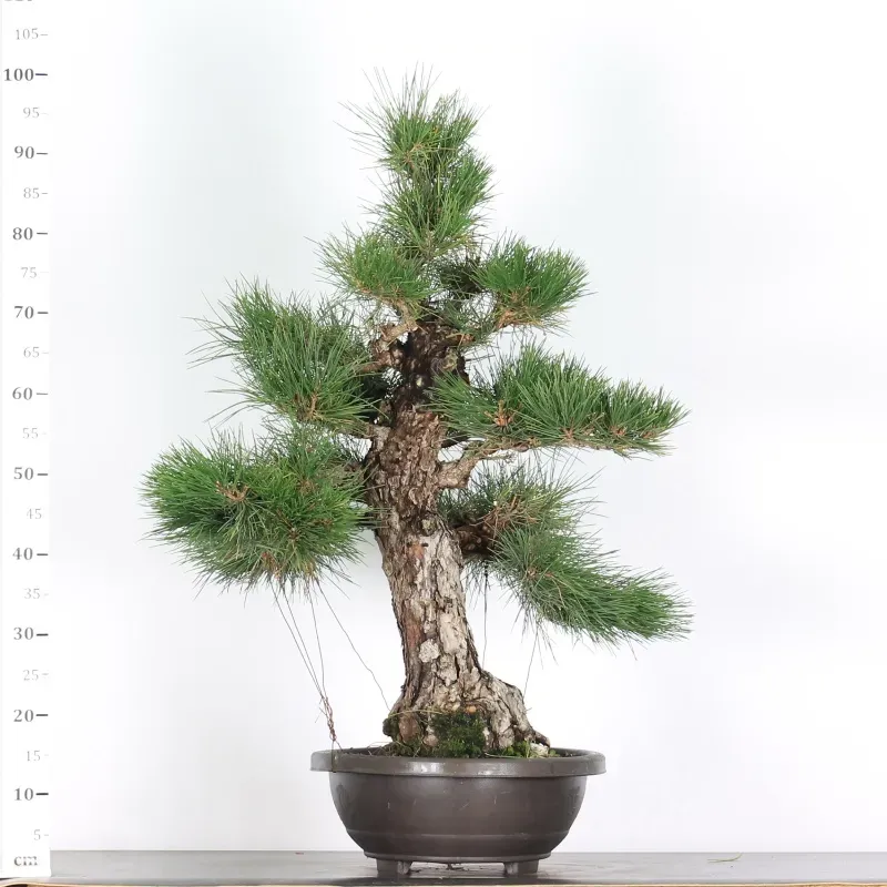 Le Pin Thunbergii est une essence de virilité par excellence: arbre droit, magnifique, puissant, bien "assis" dans son pot, se dresse vers le ciel. Le tronc sombre, avec une écorce crevassée, offre un saisissant contraste avec les aiguilles vert assez clair, pleines de fraîcheur et de santé.