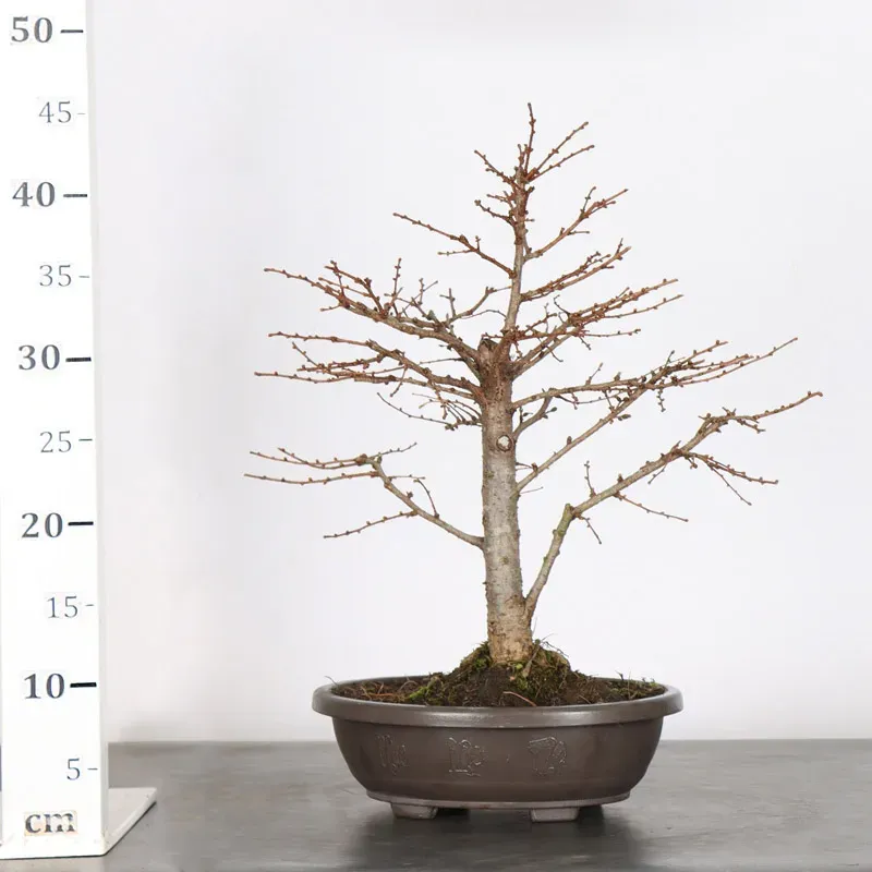 Le bonsaï mélèze "Larix decidua" est un conifère caduc apprécié en bonsaï pour son tronc texturé et ses aiguilles souples qui deviennent dorées en automne avant de tomber. Il offre une bonne tolérance à la taille et s’adapte bien aux styles droits et informels. Préfère une exposition en plein soleil et nécessite un hivernage en extérieur, hors gel intense.