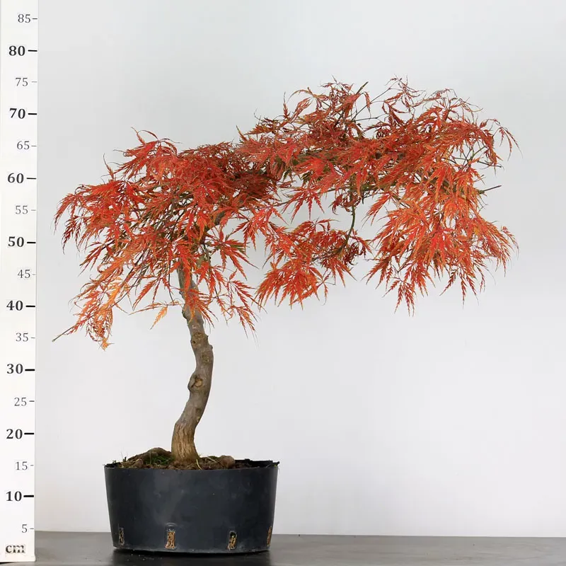 Le bonsaï érable du japon "Acer palmatum dissectum Red Garnet" est très intéressant en raison de son port retombant en cascade et de ses feuilles finement découpées changeantes au fil des saisons, passant du rouge/pourpre lumineux au printemps, puis vert en été, pour redevenir rouge vif à l’automne. Ils sont tous cultivés depuis plus de 30 ans chez nous en pépinière.