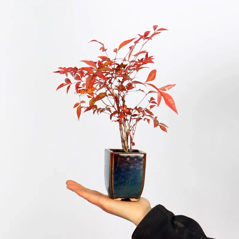 Le Nandina ou bambou sacré est un arbre au port érigé, au feuillage léger et haut . Ses tiges raides évoquent celles du bambou, elles portent des feuilles aux folioles irrégulières et ovales. Le feuillage rougeâtre quand il est jeune, vire au vert foncé durant l'été pour redevenir pourpre en automne. Ce bonsai fleurit en été, mais cette floraison passe inaperçue. Ses grappes blanches de 20-30cm de long sans intérêt donnent en automne des grappes de baies rouges, pendantes et très décoratives.