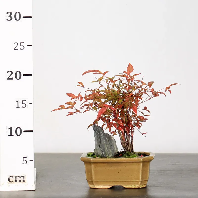 Le Nandina ou bambou sacré est un arbre au port érigé, au feuillage léger et haut . Ses tiges raides évoquent celles du bambou, elles portent des feuilles aux folioles irrégulières et ovales. Le feuillage rougeâtre quand il est jeune, vire au vert foncé durant l'été pour redevenir pourpre en automne. Ce bonsai fleurit en été, mais cette floraison passe inaperçue. Ses grappes blanches de 20-30cm de long sans intérêt donnent en automne des grappes de baies rouges, pendantes et très décoratives.