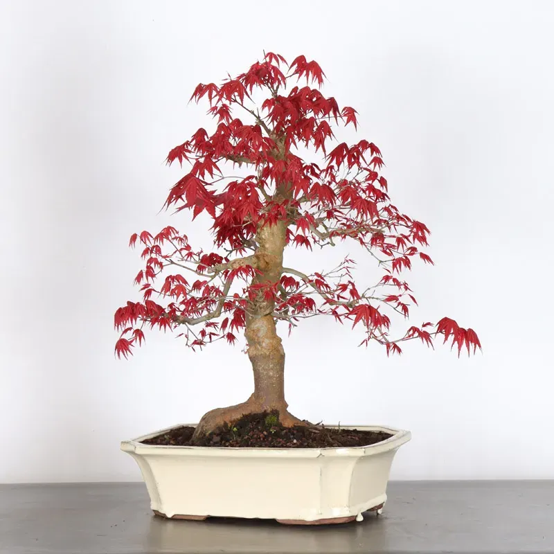 L’Erable rouge du Japon "Deshojo" en bonsaï séduit par son évolution spectaculaire au fil des saisons. Son feuillage démarre rouge profond au printemps, devient progressivement vert en été, puis se pare de superbes teintes rouge orangé à l’automne, offrant un magnifique spectacle à contempler tout au long de l’année.