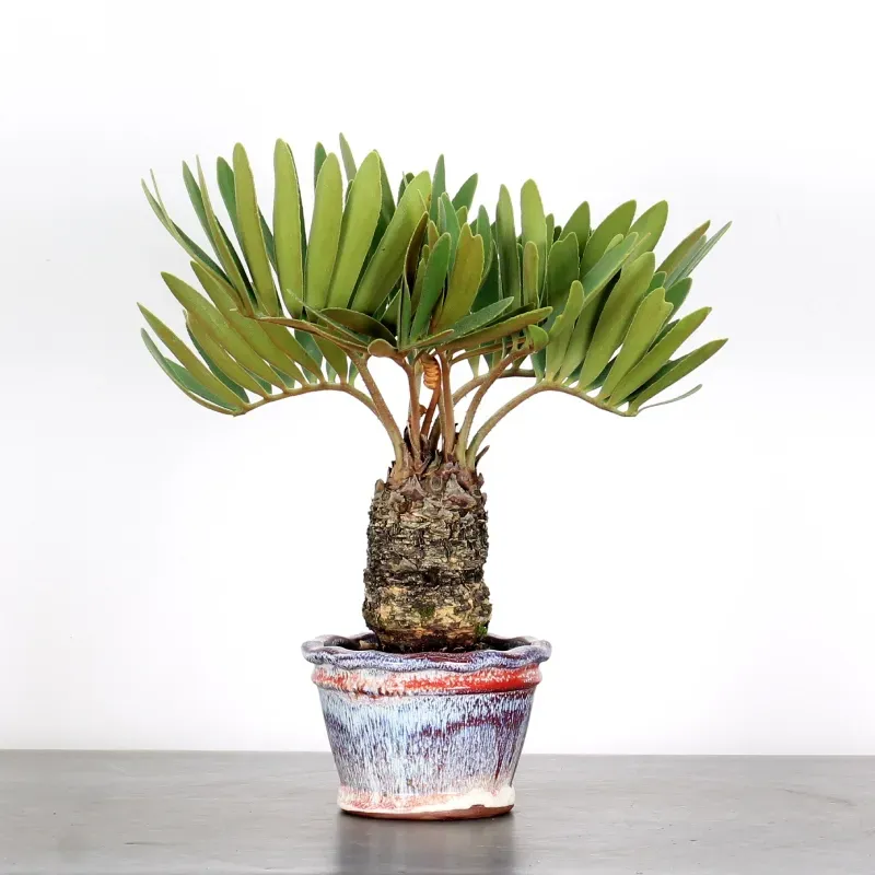 Le Zamia, Zamioculcas zamiifolia, est un arbuste au feuillage persistant, velu, dur et vert. Il est beaucoup utilisé comme plante d’intérieur, en serre ou véranda. Le zamia est originaire du Mexique, des plaines côtières sableuses et chaudes. Les Américains le nomment « Cardboard palm », soit « palmier en carton ». Il ne produit pas de fleurs mais des cônes. Il est dioïque, c’est-à-dire qu’il donne des cônes femelles aux graines rouges et des cônes mâles sur des plants séparés.