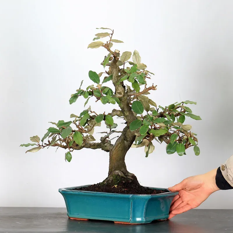 Le bonsai Elaeagnus est un arbuste très robuste catégorisé pour sa croissance rapide et la couleur particulière de son feuillage persistant. Il se démarque par son coloris gris métal sur ses feuilles, qui deviennent vert mat puis vert brillant. Il possède des fleurs blanches en forme de clochettes et des fruits ovoïdes bruns.